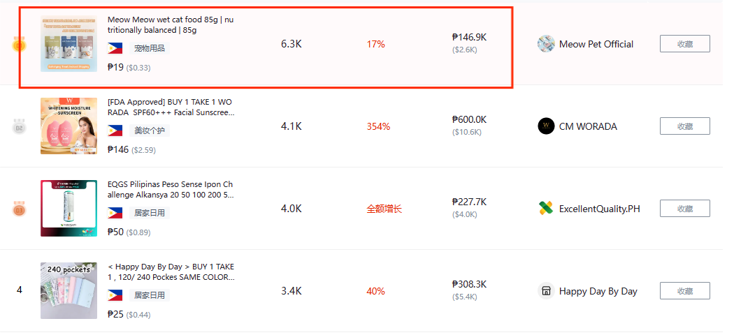 就拿TikTok Shop(菲律宾)热销商品榜单的第一名来讲吧,这款是来自Meow Pet Official小店的猫粮产品,主页名称标注为“Meow Meow wet cat food 85g | nutritionally balanced | 85g”(喵喵湿猫粮 85克 | 营养均衡 | 85克)。这种言简意赅的名称,清晰直观地将你要卖的产品以及产品效果表达出来,让你的客户在看到第一眼时明白,这就是我想要的产品。