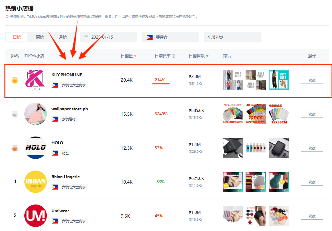 最近兔克在观察菲律宾TikTok Shop榜单时发现了一匹黑马——KILY.PHONLINE,一个主打女士服装的小店,竟然靠着214%的日增长率,在1月15日以5.12万美元的销售额直接冲上了榜单第一!
