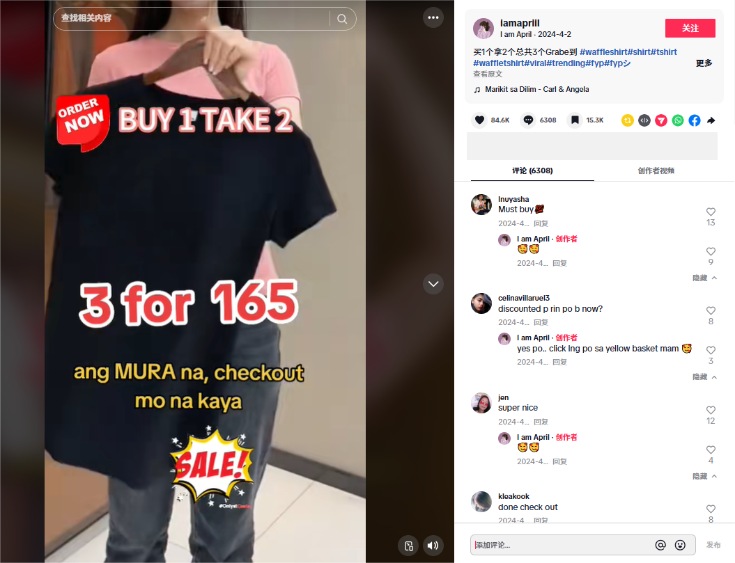 就拿在TikTok拥有2.34万粉丝的达人@iamapriil来讲,她发布的一条穿搭视频播放量达到1550万次,直接为店铺贡献了6.765万美元(约人民币492万元)的销售额。