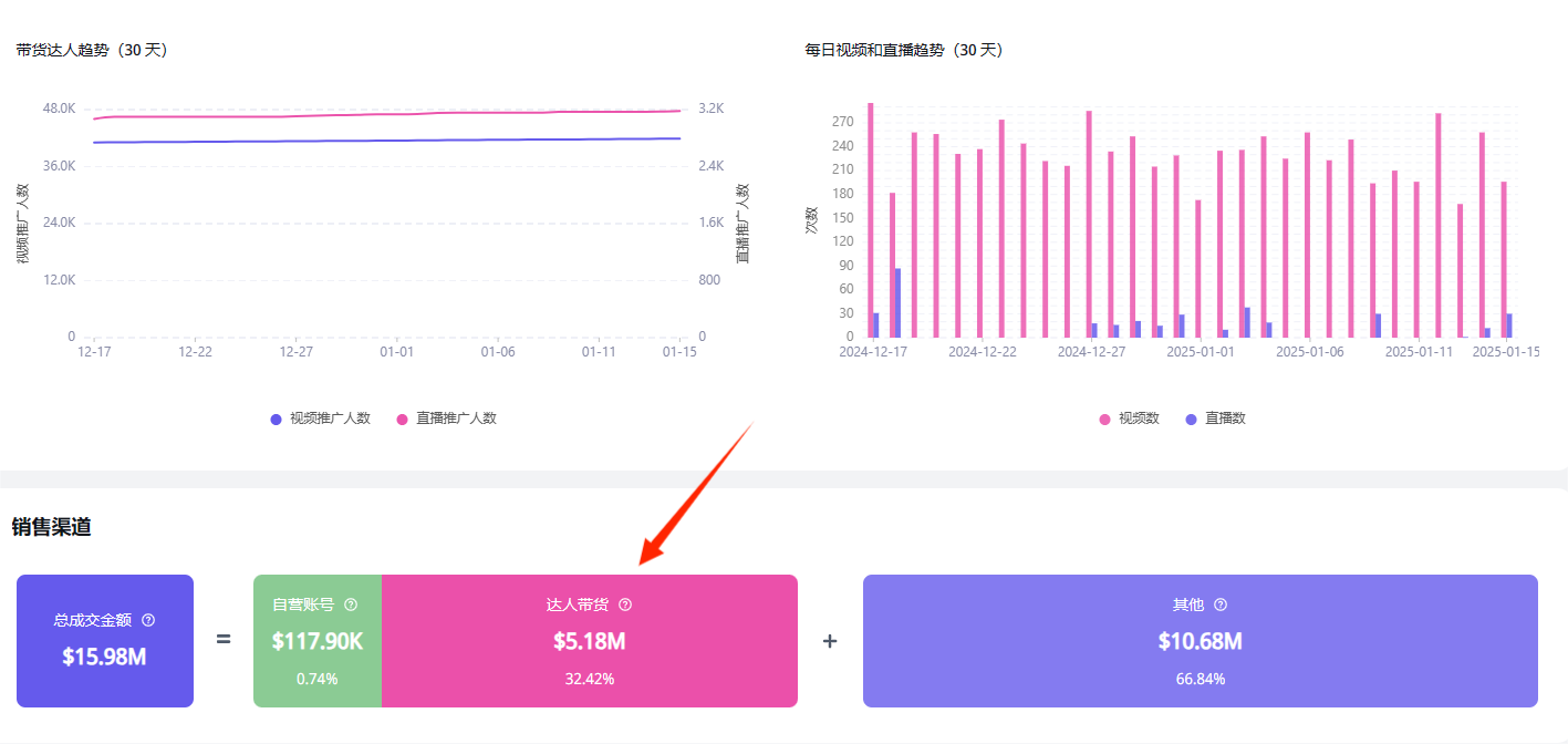 在TikTok这样的内容驱动平台上,达人营销几乎是每个店铺不可或缺的一环。KILY.PHONLINE店铺也不例外,数据显示,在过去30天内,店铺通过达人带货实现了518万美元(约人民币3767万元)的成交额,占其总GMV的32.42%。