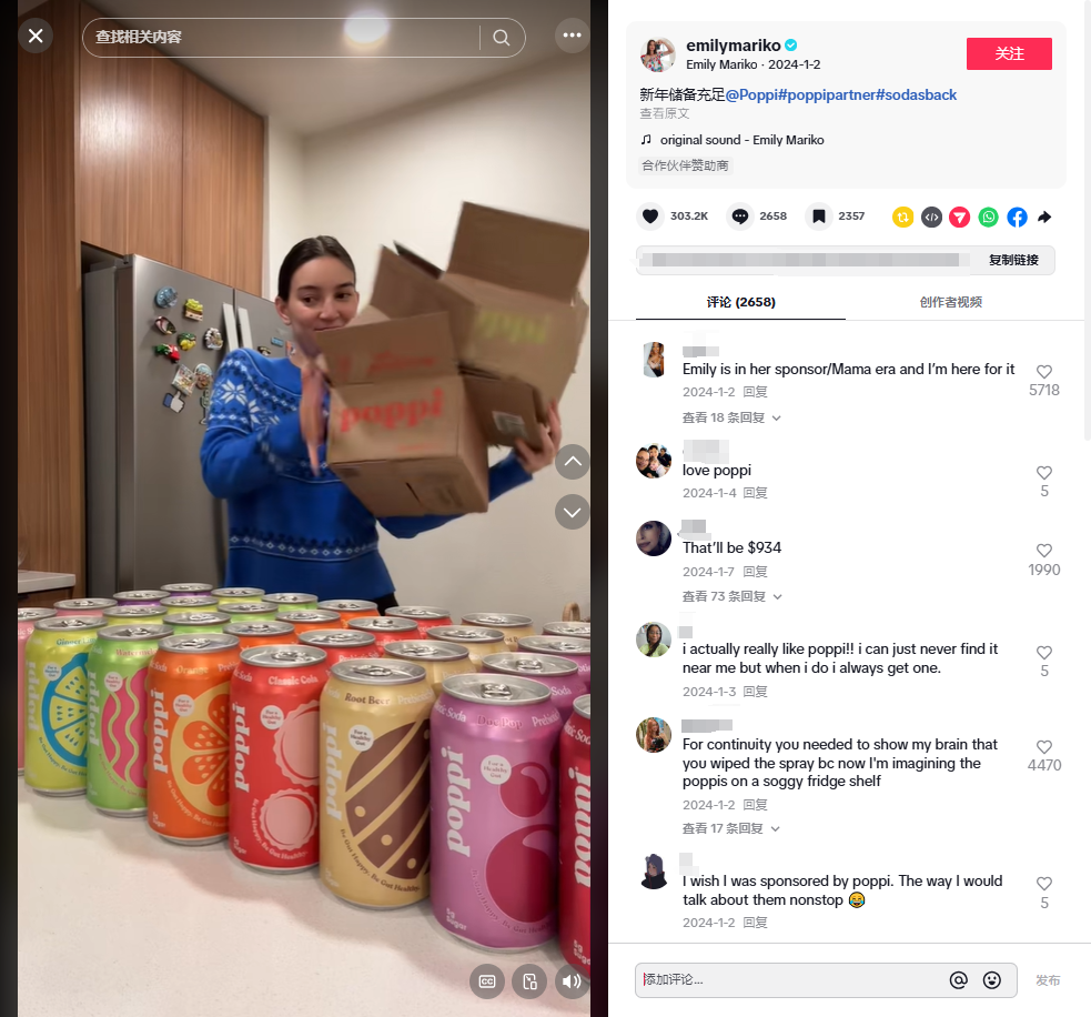 健康苏打水品牌Poppi和网红Emily Mariko合作,让她在“冰箱补货”的视频中自然露出产品。视频没有硬广的生硬推销,而是展示生活化场景,最终拿下2410万播放量。品牌通过这种方式完成了“无感种草”。
