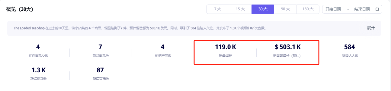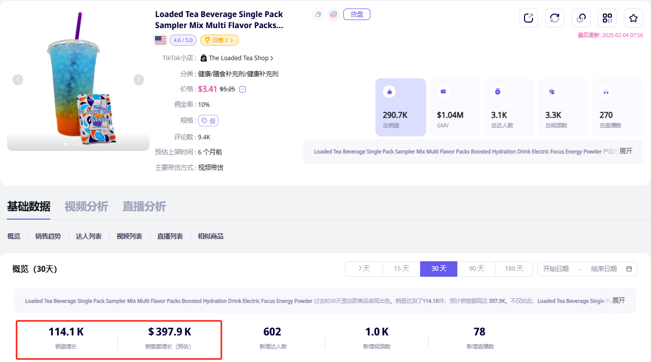 先来看看最新数据——过去一个月,他们家卖出了11.9万件商品,销售额飙到50.31万美元。但真正让人震惊的是,光是一款能量茶饮包,就拿下了近40万美元的销售额!也就是说,买The Loaded Tea Shop的,十个里面至少有八个都是冲着这个能量茶来的。