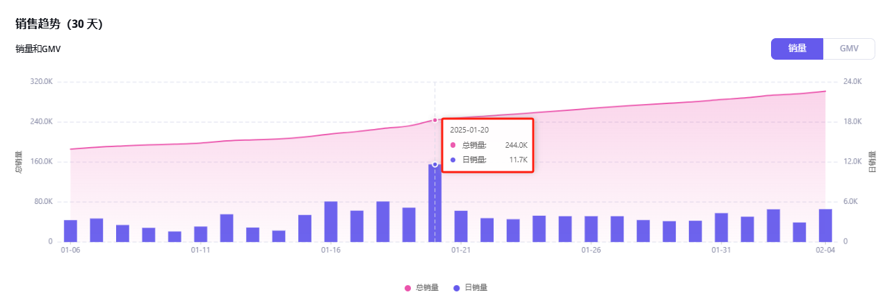 再看看1月份的单日销量,1月20日这天,直接冲破1.17万单,品牌累计销量已经突破24.4万单。这个增长速度,可以说是妥妥的黑马了!