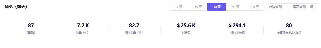 产品销量火爆的同时,The Loaded Tea Shop在直播带货上也做得有声有色。虽然他们的直播成绩不像一些大品牌那样一夜爆单,但稳步增长的销售数据却同样可观。数据显示,过去一个月,他们和80位达人合作,累计开了87场直播,总共卖出7200件商品,销售额达到了2.56万美元。平均下来,每场直播能卖出82.7件商品,场均销售额294.1美元。