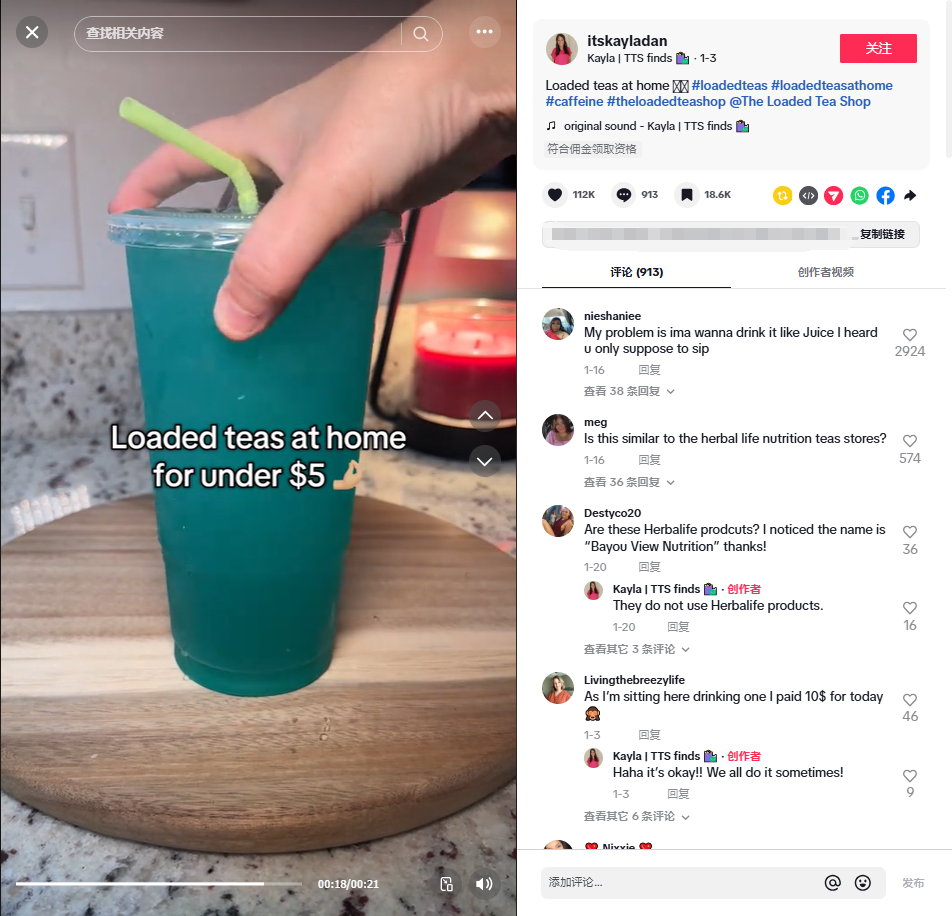 最有代表性的一条视频来自达人@Kayla | TTS finds,她直接在镜头前展示了能量茶包的冲泡过程,还特意在标题里强调了——“在家自制茶饮,成本低于5美元”。精准击中了想省钱又想喝点健康饮品的消费者心理。