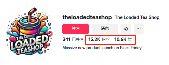 除了达人带货,The Loaded Tea Shop的官方账号运营也在慢慢发力,逐步积累自己的品牌影响力。目前,该品牌的TikTok官方账号@theloadedteashop已经吸引了1.52万粉丝,累计点赞数接近1.06万,虽然相比大品牌的粉丝量不算庞大,但增长趋势稳健,说明越来越多的人开始关注这款能量茶品牌。