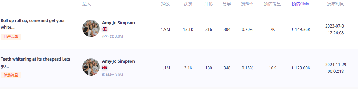 根据第三方数据显示,他们合作的达人中,@Amy-Jo Simpson(粉丝300万)贡献最大,仅靠一条牙齿美白贴片的推广视频,就带来了14.9万英镑的GMV,整体GMV更是达到了59.24万英镑。