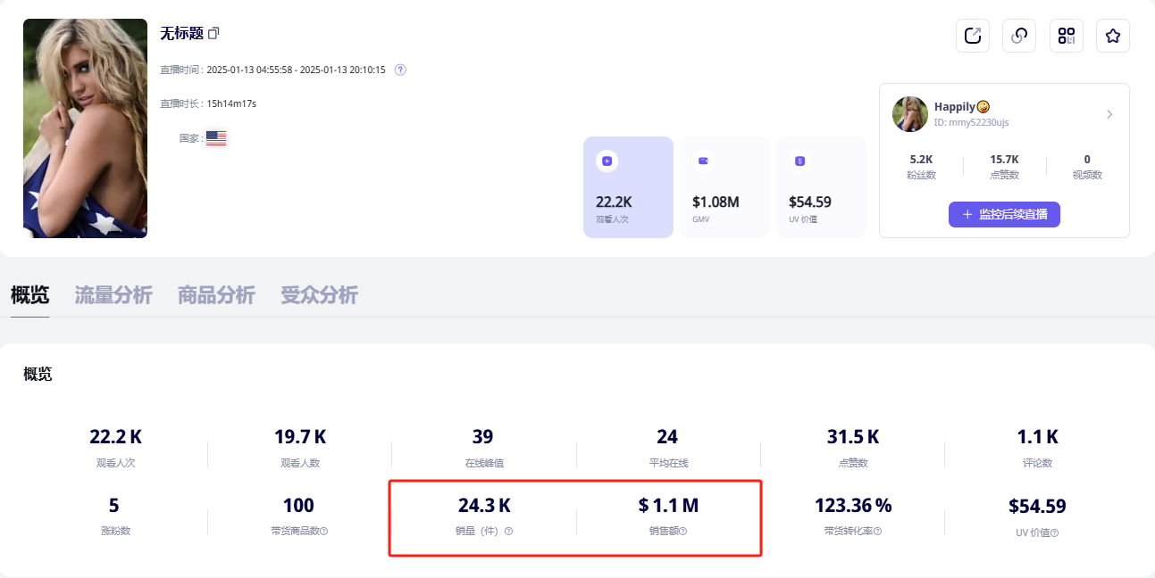 其中,和达人@mmy52230ujs的合作直播最为成功。1场15小时14分钟的超长直播,共吸引了2.22万观众,预估售出2.43万件商品,销售额高达108万美元(约787万元人民币)。这样的成绩,可以说相当可观了。