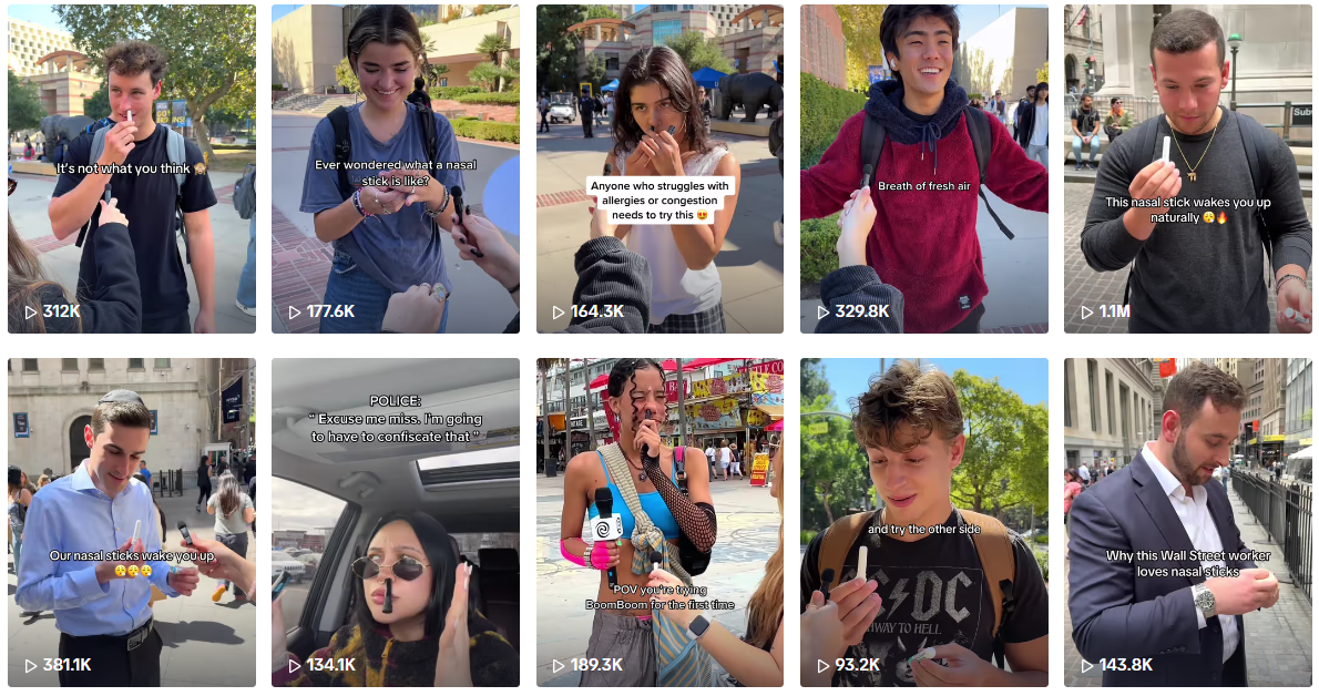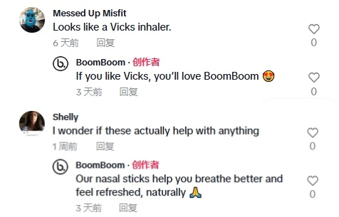 BoomBoom的账号运营强调“真实”二字,内容并不依赖精致剪辑或夸张营销,而是直接在街头随机寻找路人,让他们现场试用鼻通清醒棒,并分享最直观的使用感受。每个视频通常都控制在20秒内,简洁明了。