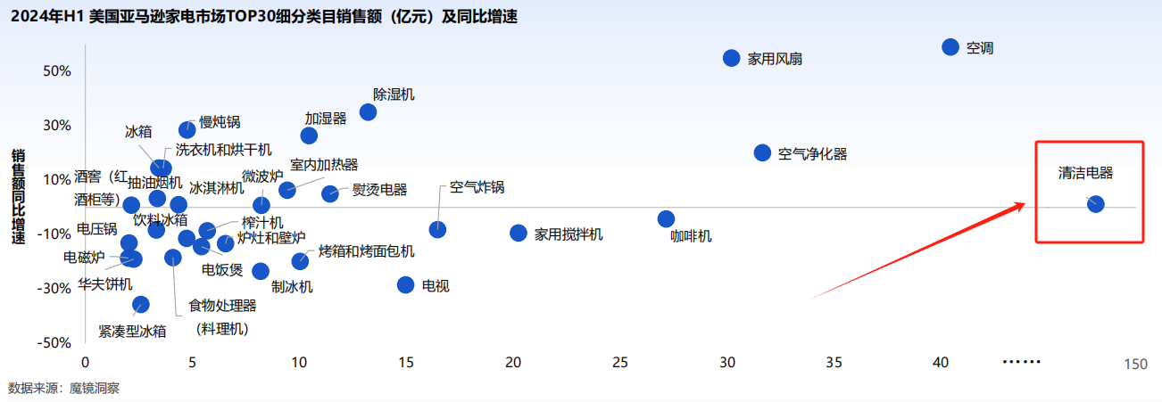 1、成熟市场要升级:北美、西欧虽然增长慢,但智能家居渗透率已超40%,消费者愿意为“黑科技”买单。魔镜洞察数据显示,2024年H1美国亚马逊家电市场中清洁电器规模最大,销售额达到127.5亿元,同比微增1.2%。