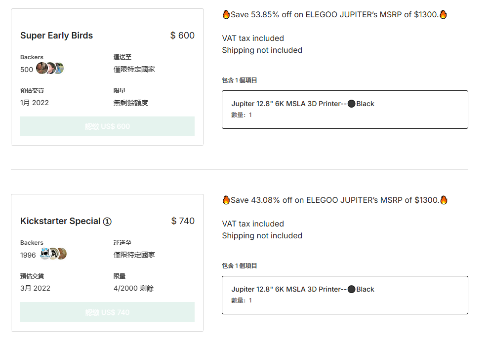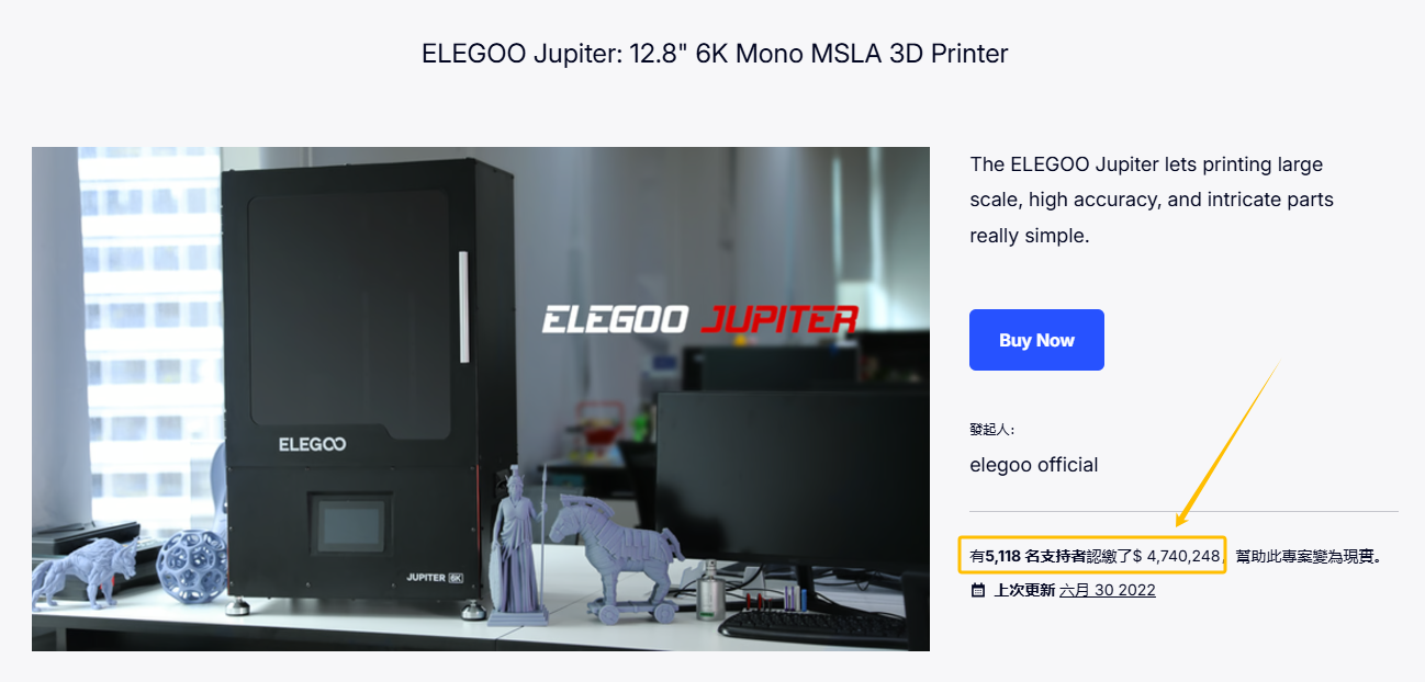 2021年,ELEGOO旗下的12.8寸6K打印机产品“Jupiter”登陆Kickstarter,48小时众筹了320万美元。