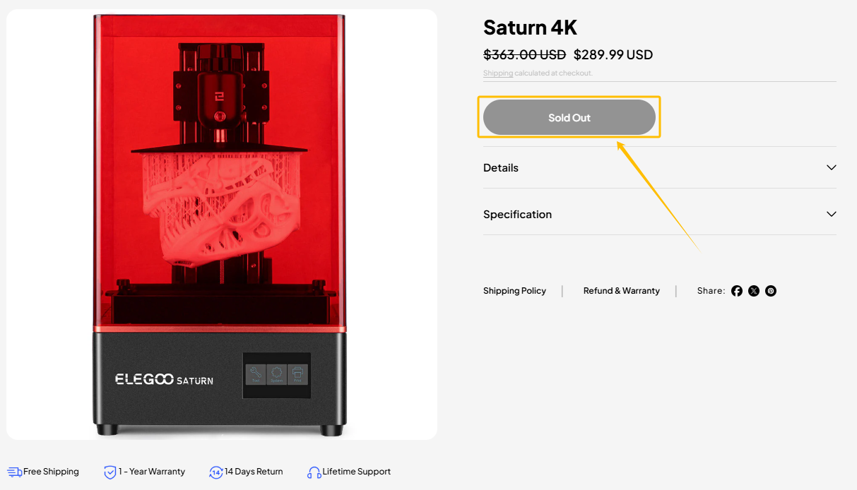 ELEGOO Saturn 4K在官网已售空