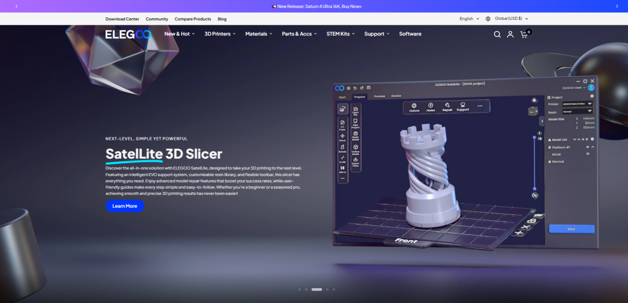 2020年,ELEGOO发布全球首款500美元以下4K打印机Saturn,官网预售一分钟销售额破千万。这款打印机不仅能满足牙医打印临时牙冠的需求,也让手办玩家能够复刻出细致入微的模型,迅速赢得了广泛好评。