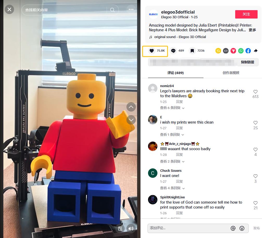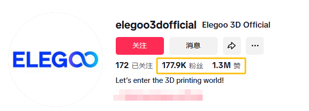 TikTok则是ELEGOO的另一大杀手锏,其官方账号(@elegoo3dofficial)目前有17.79万粉丝,获赞量超130万,虽然不算顶流,凭借一系列超硬核的3D打印视频,成功吸引了一大批极客粉丝。
