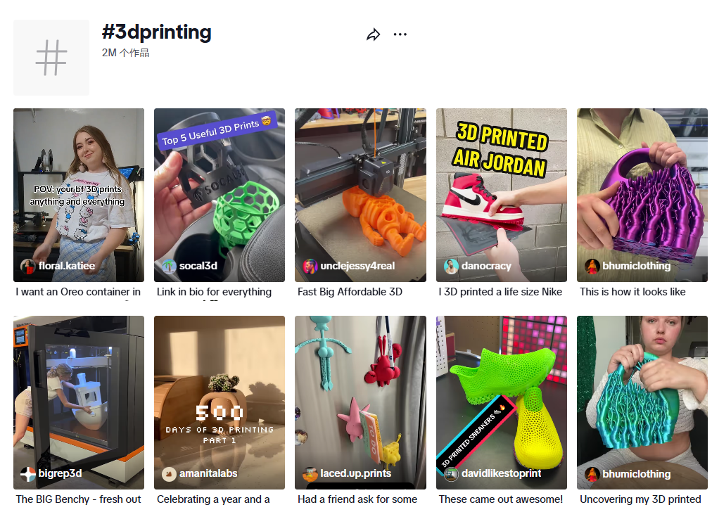 搜索#3dprinting,你会看到200万条相关作品。总播放量高达273亿,点赞量接近5.9亿。