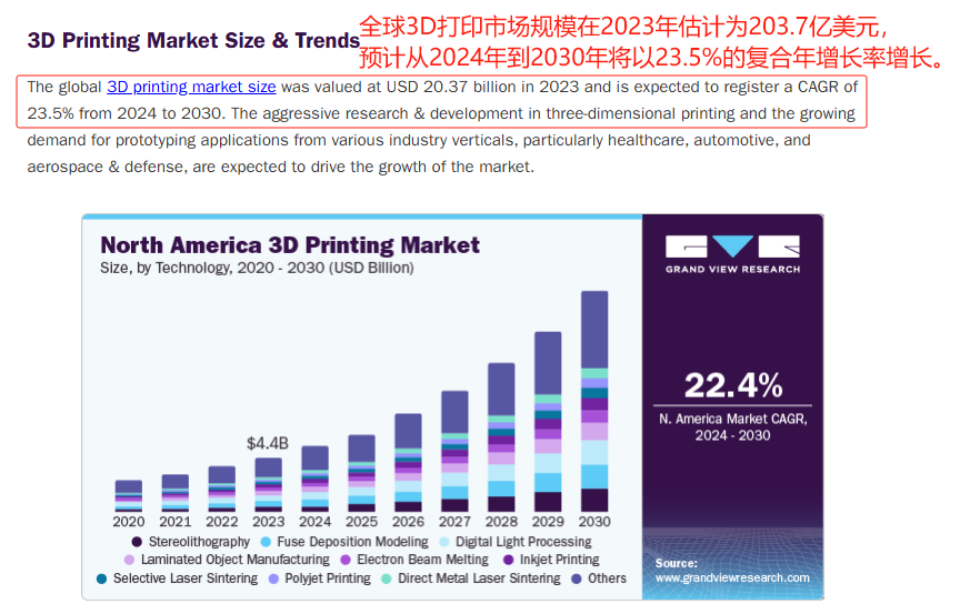 根据Grand View Research数据,2023年全球3D打印市场规模冲到203.7亿美元,未来六年还要以23.5%的速度狂飙。