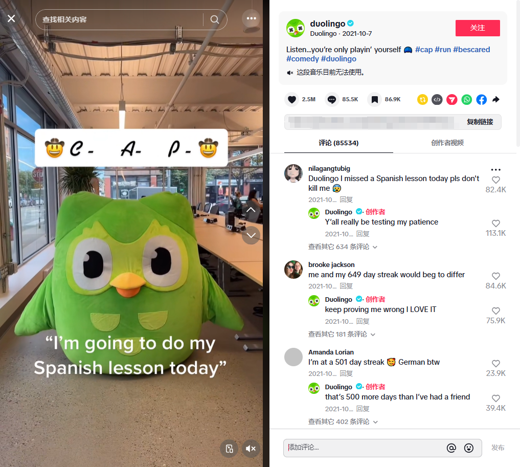 Duolingo通过与幽默类达人合作,用轻松搞笑的方式推广语言学习。达人们通过创意视频展示学习语言的乐趣,甚至发起了一些搞笑挑战,比如“用外语点外卖”。这种互动性强的内容不仅吸引了大量用户参与,还让品牌形象更加年轻化。