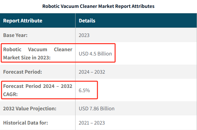 这个曾经的小众产品,如今已悄悄进入了全球家庭。根据Global Market Insight的数据,2023年全球扫地机器人市场规模冲到45亿美元,比2021年增长近25%,预计到2032年还能保持6.5%的年增速。