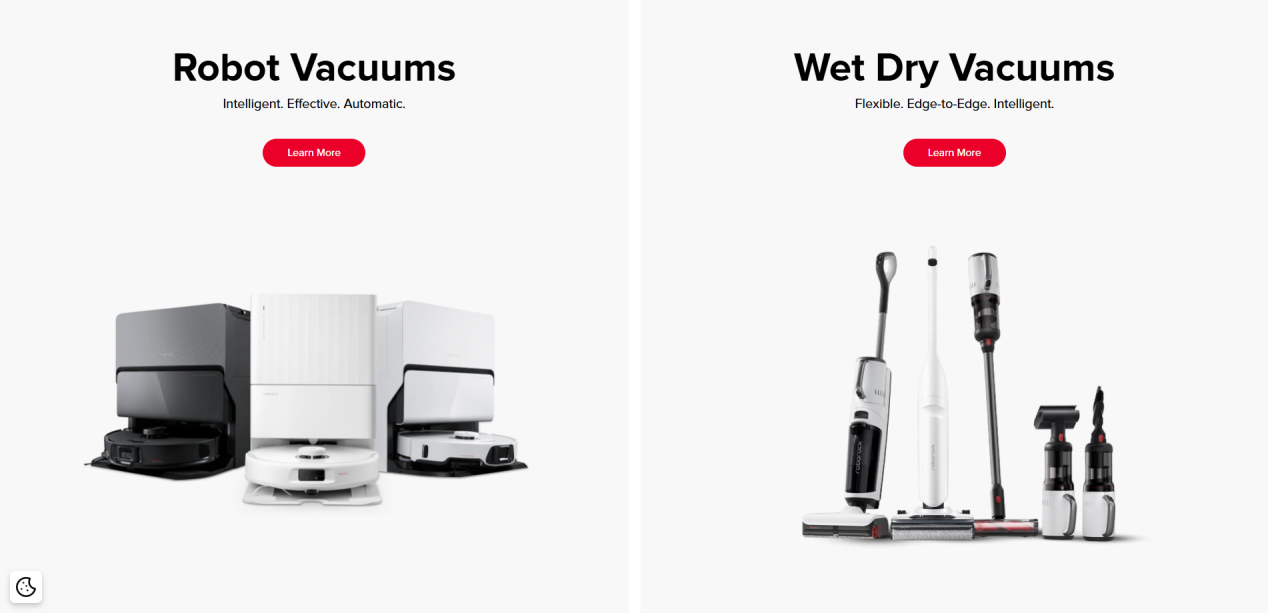 点开首页,每个产品系列都配有高清图片和详细的功能介绍,方便用户浏览和对比。产品页里,扫地机、洗地机、吸尘器按使用场景分类,技术参数藏在详情页,简介都是一句话击中痛点:“养猫家庭每日清洁时间从35分钟缩短至5分钟”。