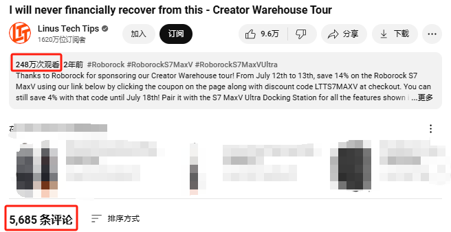 截至目前,石头科技的官方账号@Roborock Global有3.15万订阅者,最火的一条视频播放量超548万。该品牌在YouTube上主要和科技类博主合作,通过深度测评视频来展示产品性能。