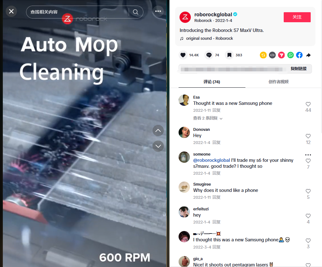 在TikTok上,石头科技的官方账号@roborockglobal已经积累了14.91万粉丝,视频总获赞量超过65.5万。