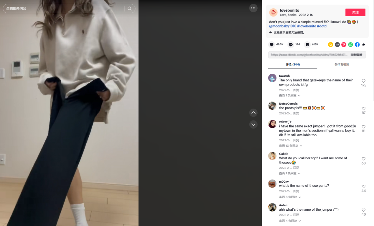 在TikTok上拥有17.09万粉丝的达人@moonbaby1010,便是合作达人之一,她发布试穿Love, Bonito品牌新品上衣、裤子的展示视频,经过时间发酵,目前在TikTok上获得了320万的播放量和4.93万的点赞量,为品牌带来了不错的流量。