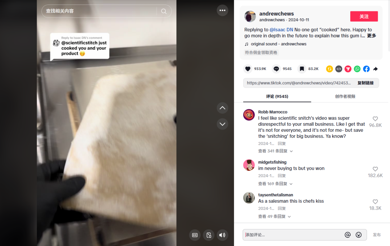 该达人的推广视频也与品牌主营账号内容相似,都是通过传统与创新口香糖对比,来达到侧面推广的效果。例如2024年10月11日的这期视频,一经发布就获得了1940万的播放量,为Nathan and Sons品牌带来了47.46万美元的预估销售额。