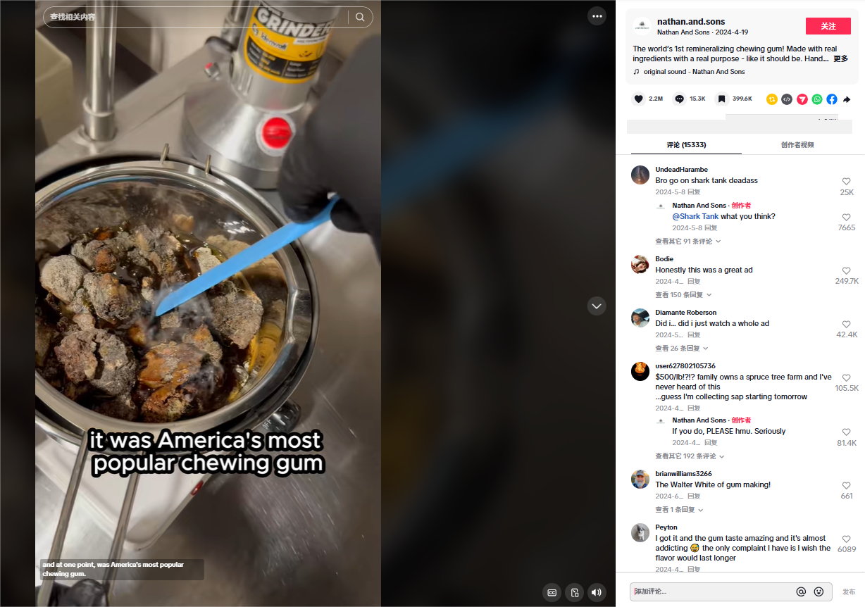就以3940万播放量的这条视频为例,通过严谨科学的角度来向观众展示传统口香糖的成分做法,用一种视觉冲击侧面展示Nathan and Sons品牌成分更健康的好处,这种巧妙的对比和直观的呈现,让观众在了解真相的同时也,对品牌的专业性和用心印象深刻。