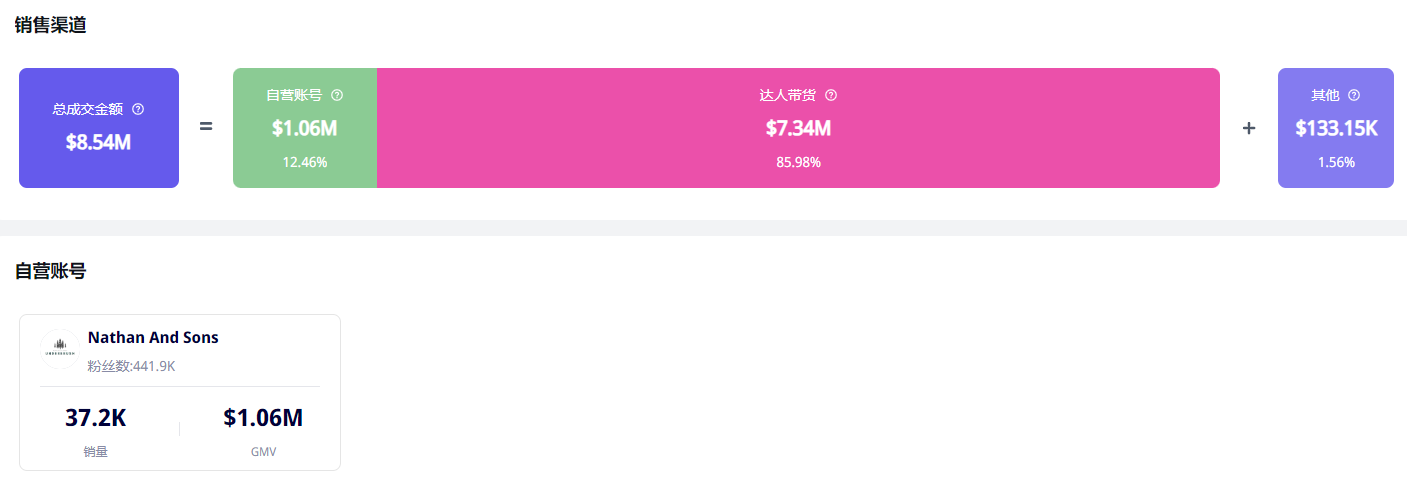据第三方平台统计,截至目前,Nathan and Sons品牌的合作达人约为4700名,这些达人为他们的产品带来了734万美元的销售额,占据了品牌销量的85.98%,可以说是销售的主力了。
