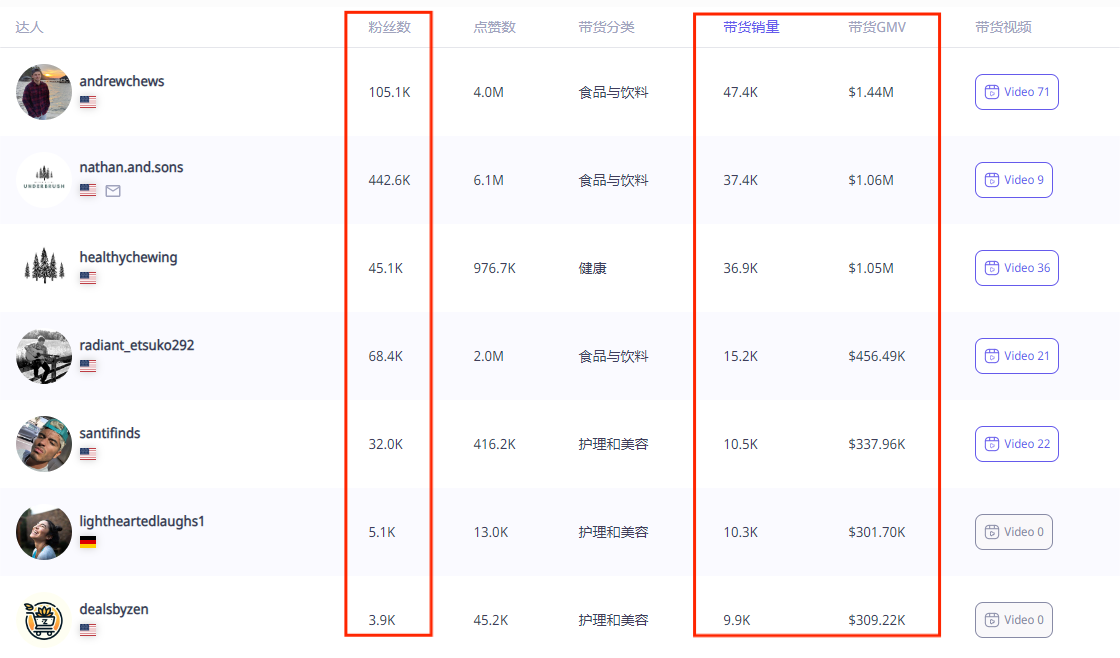 比如,Nathan and Sons品牌销量榜最高的达人@andrewchews,粉丝数仅有10.51万,却为产品带来了144万美元的销售额。