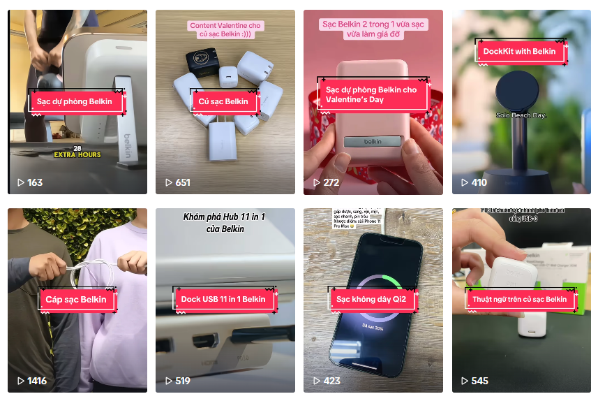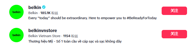 该品牌的TikTok子账号@belkinvnstore,则是针对越南市场新开设的账号,目前粉丝量仅有1154个,还在起步阶段,但一直保持着良好的更新频率,即每隔2-3天就会发布一则日常使用belkin产品的视频。