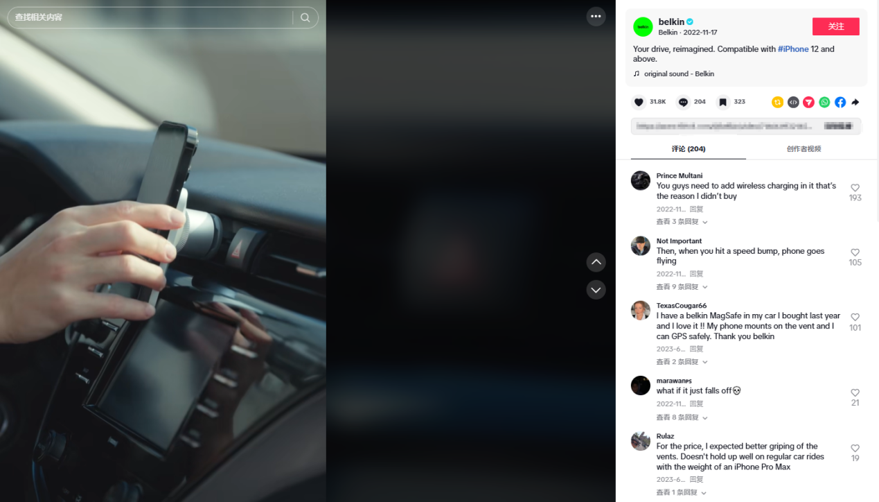 内容很日常,就是一个在车内拍摄的短视频,为用户展示了belkin品牌的无线充电宝还可以作为手机支架使用,这样手机既可以直接在车内进行无线充电,不用为了没带数据线而烦恼,还能作为手机支架使用,两全其美、更加方便!