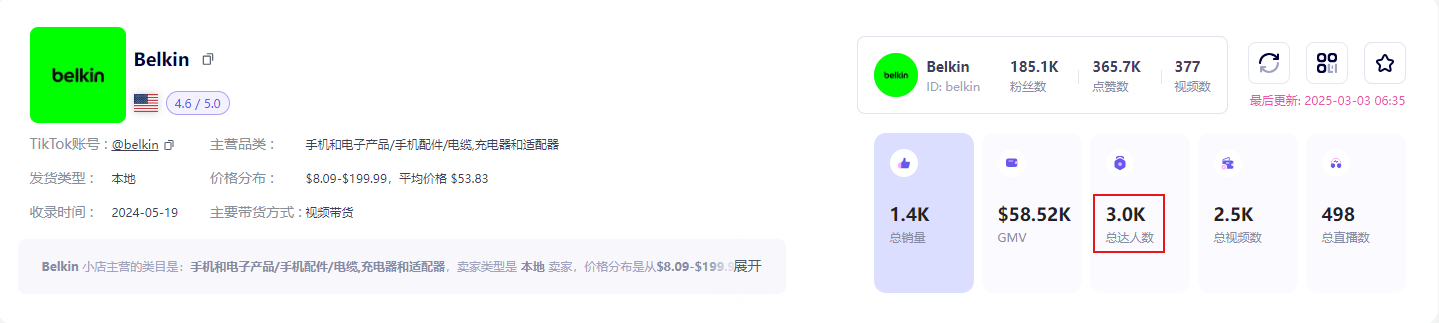 据第三方数据平台显示,Belkin合作的达人总数已达到3000人。