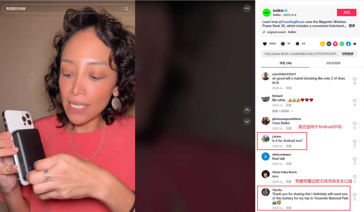 例如,达人@travelingrosas为belkin品牌拍摄的一个无线充电宝的带货短视频,播放量达到了15.36万。