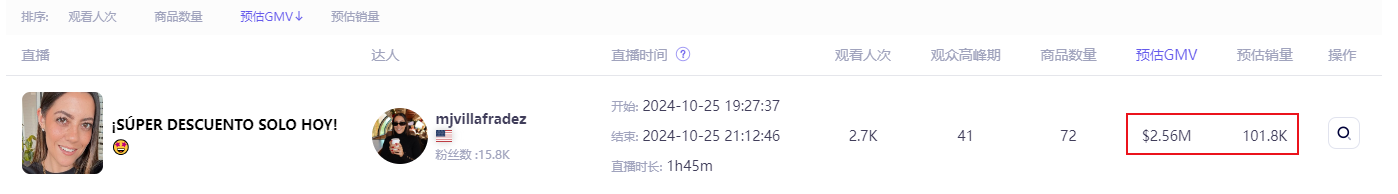 TikTok达人@mjvillafradez便带货了他们的产品,在一场1小时45分钟的直播里,共吸引了2700人前来观看,预估售出了10.18万件商品,销售额达到256万美元,折合成人民币约1865万元,取得了亮眼的成绩!