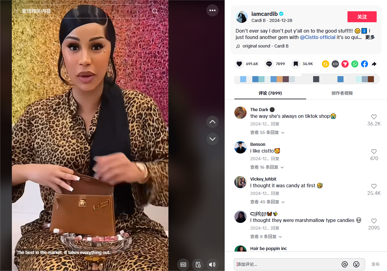 Cistto品牌通过达人带货视频初步验证了这类内容的有效性后,决定把握圣诞季的流量“乘胜追击”,并顺势敲定了与美国明星Cardi B的合作。