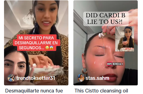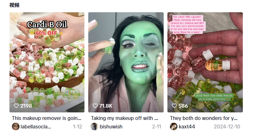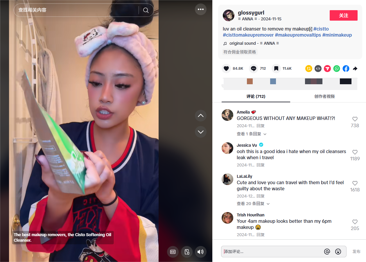 以黑五期间的案例为例,美妆达人@glossygurl发布了一条展示Cistto品牌卸妆油的短视频。这条视频锁定了“卸妆前后对比”这一高转化方向,结合精准投流,最终获得了280万次流量,并带来了超过3万美元的销售额。