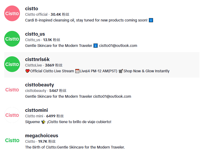 当然,Cistto品牌也没忘了打造自有的TikTok账号矩阵,共开设了约8个账号,视频号和直播号分工明确。