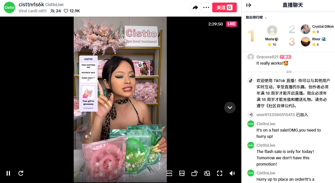 他们的直播账号@CisttoLive,会在每天的固定时间进行直播,目前共开设了14场直播,场均人次为2000人,为品牌带来了稳定的流量曝光。