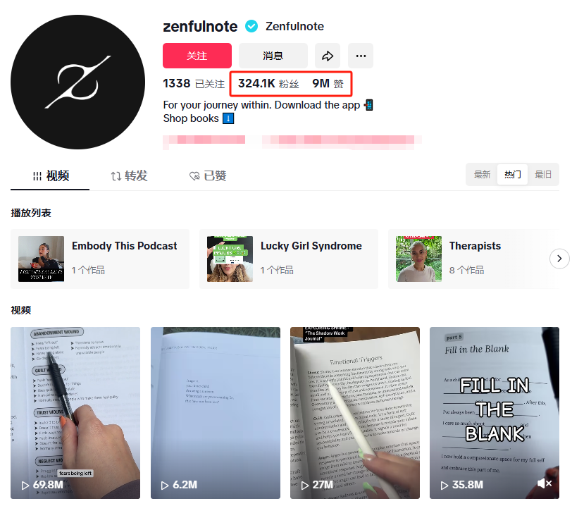 该品牌的TikTok官方账号@zenfulnote,目前已累计收获32.41万粉丝,总获赞量超过900万。更新频率为每周5次,这种稳定的更新节奏对维护用户粘性大有好处。发布的内容,以“可视化疗愈”为主,通过书写动作、纸张翻动声等动态画面,直接刺激着用户的感官,往往能够迅速抓住观看者的注意力,促成传播。