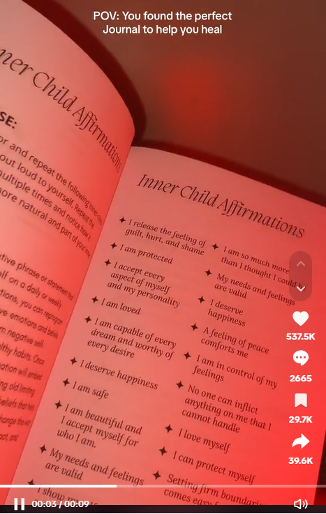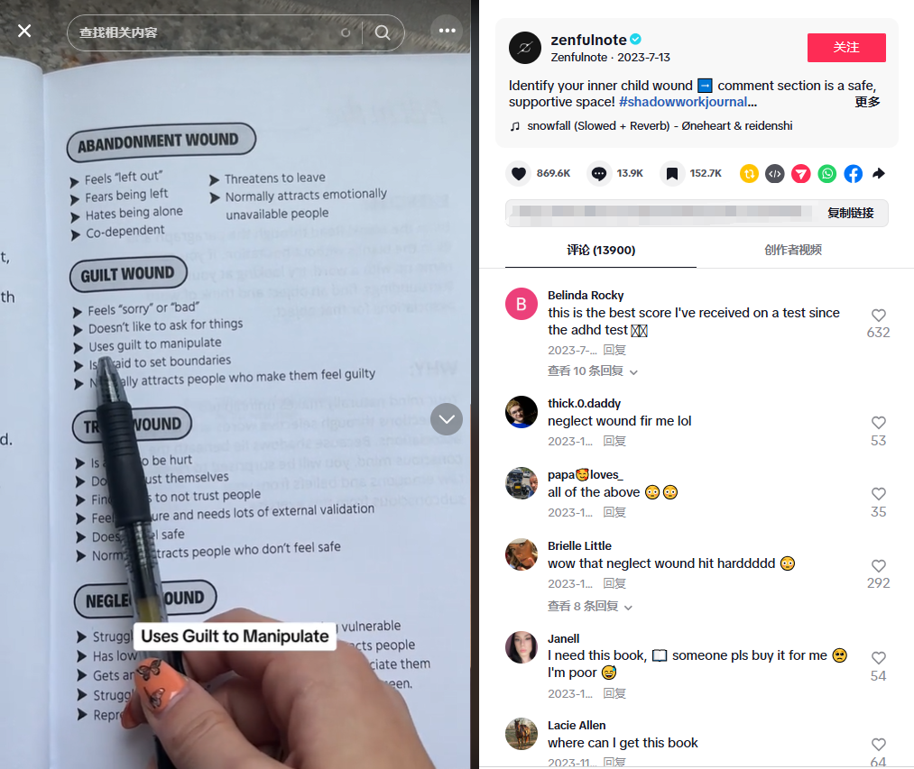 他们账号播放量最高的,是一条展示《The Shadow Work Journal》内页的视频,主题就是“识别你孩童时期所受的创伤”,播放量高达6980万次,传播效果非常不错。