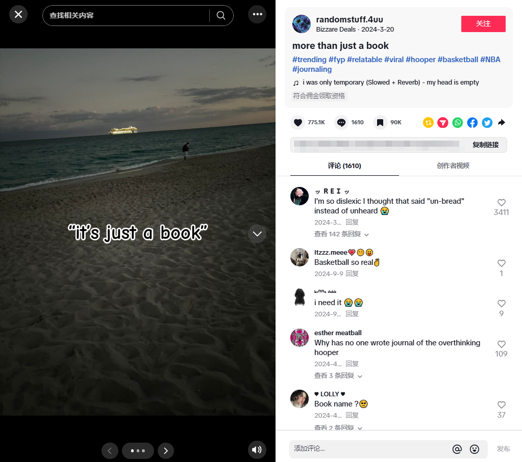 另一粉丝量2.42万的TikTok达人@randomstuff.4uu,也推广了书籍,通过图文内容“这只是一本书”与配文“不仅仅是一本书”制造了认知反差。这种反差,能更有效地吸引了用户的注意力,激发他们的好奇心。该条视频的播放量,已达到780万,成为品牌传播的又一爆款案例。