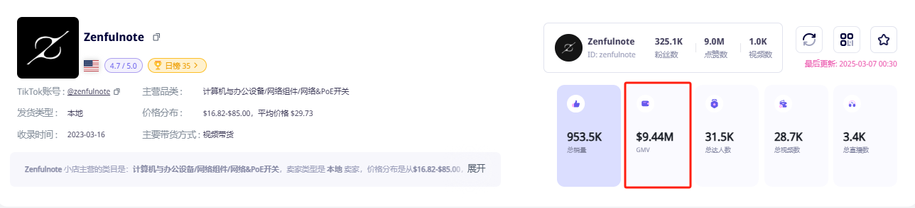 数据显示,通过视频带货,目前zenfulnote小店在TikTok美区的销售额,已超过944万美元,吸金能力非常强。