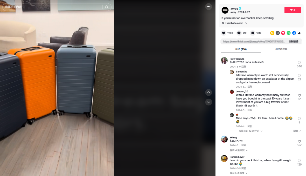 据悉,Away品牌在2021年就入驻了TikTok平台,截至目前,其TikTok账号@away,虽然粉丝量只有3.84万,但是获赞量达到了270万。