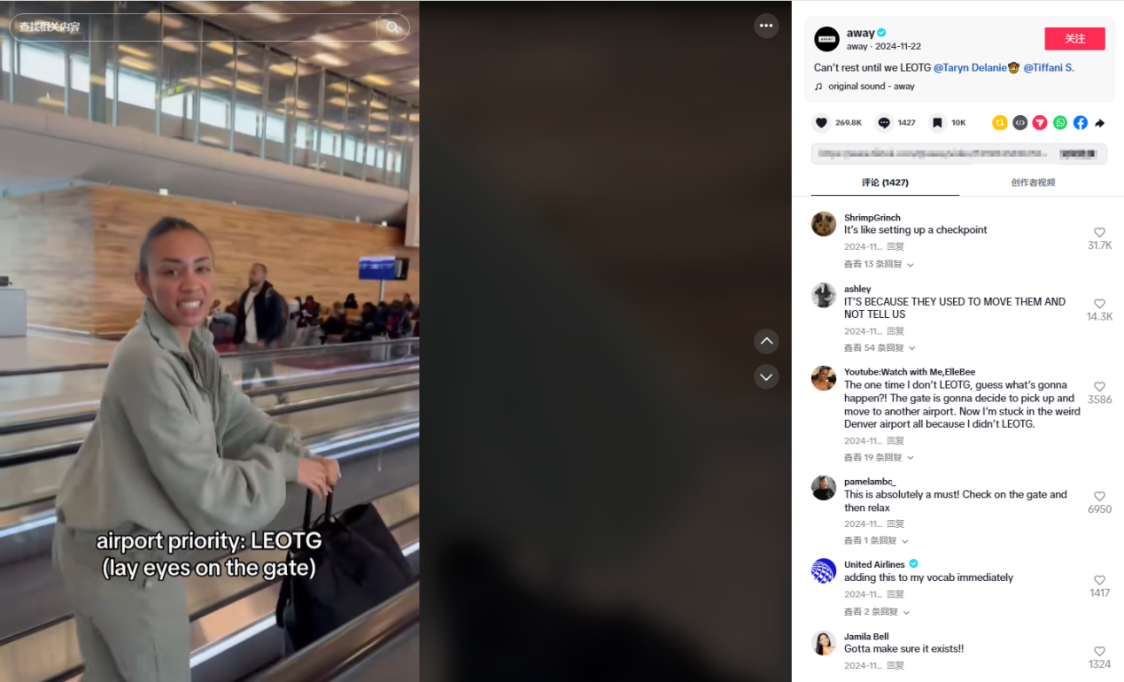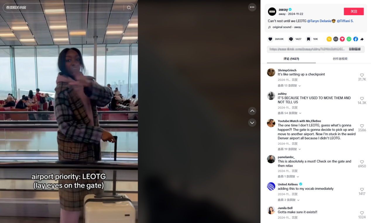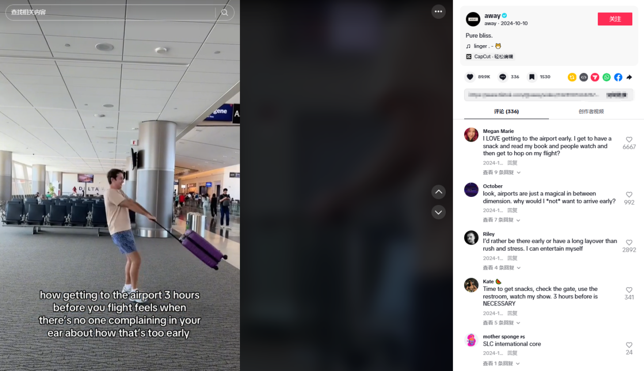 在达人的合作策略上,Away品牌采用了“双人联动”模式,例如邀请TikTok达人@taryndelaniesmith和@tiffonfifth共同演绎机场候机场景,通过自然互动引发观众共鸣,单条视频播放量达到了260万,评论区涌现大量旅行经验分享,形成了二次传播,在无形中让更多的人认识品牌、了解品牌。
