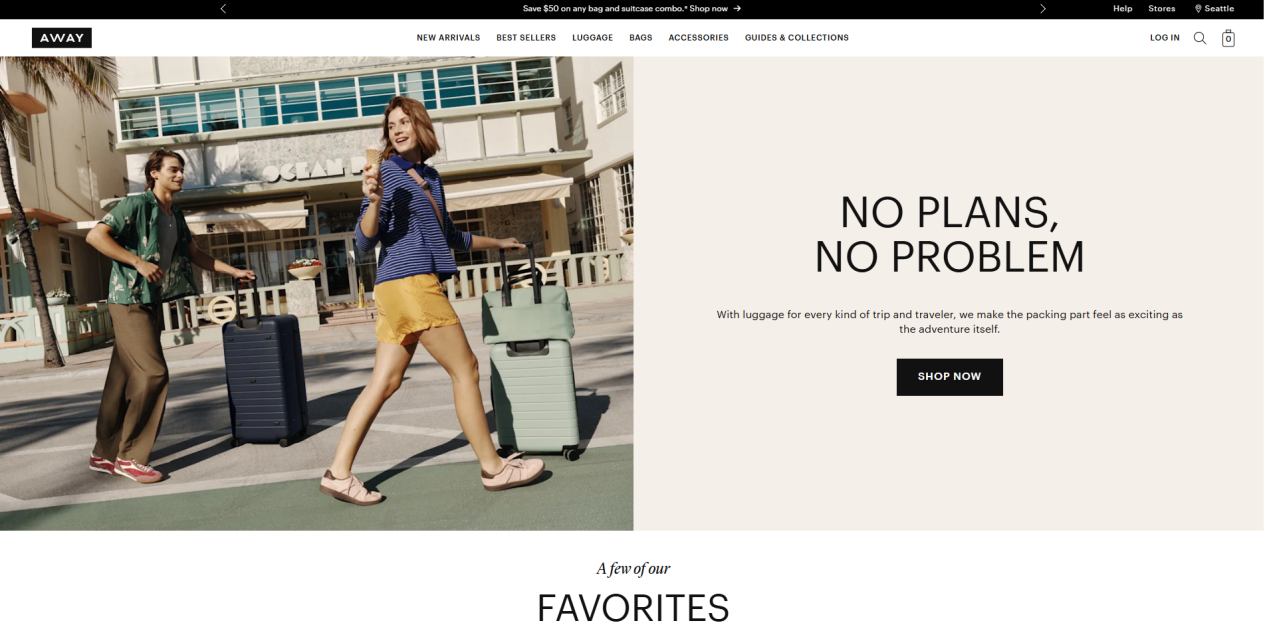 为减少对第三方平台的依赖,Away品牌还搭建了独立站。官网采用极简设计,产品页聚焦核心参数对比与使用场景图解,用户可快速获取尺寸、重量、颜色等信息,且商城功能还支持用户直接下单,从挑选到购买一气呵成。