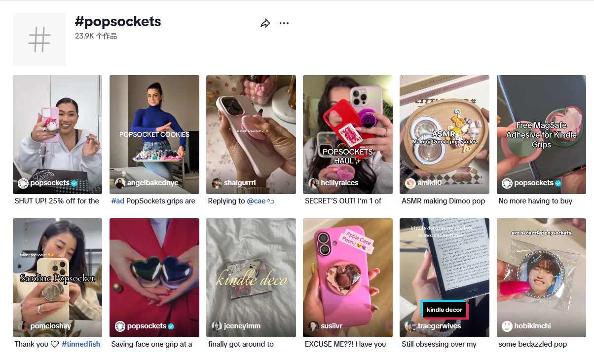 目前,TikTok相关话题#popsockets的用户生成视频已经超过2.39万个,累计播放约2500万次。