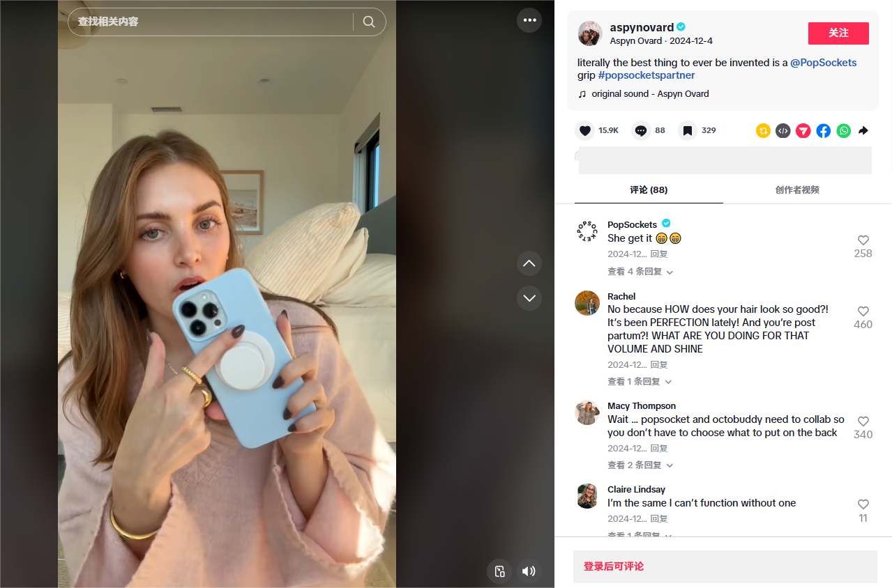 为了进一步增强用户参与感,PopSockets品牌还鼓励TikTok用户发布视频展示产品的创意用法。让更多用户看到了产品的多功能性,以及与日常生活场景的紧密结合。