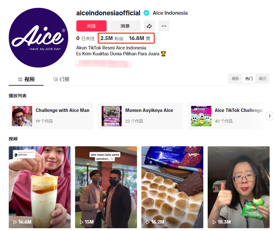 截至目前,其官方账号@aiceindonesiaofficial吸引了250万粉丝,点赞量超1680万,主要发三类视频:直接介绍产品的广告片、设计好的搞笑短片,还有街头随机拉路人试吃。