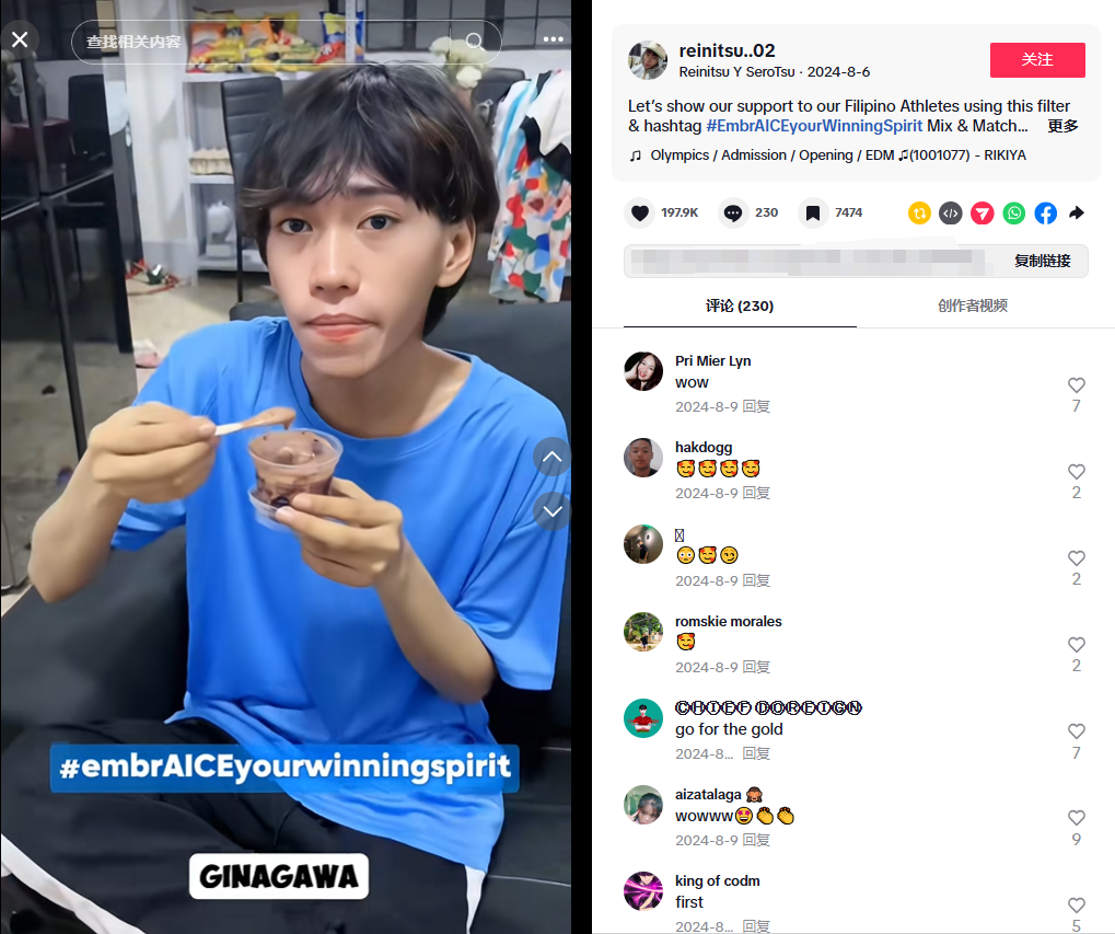 还有菲律宾达人@reinitsu..02(270万粉丝),他参与了艾雪推出的巴黎奥运会相关活动#EmbrAICEyourWinningSpirit,为他支持的菲律宾运动员加油。